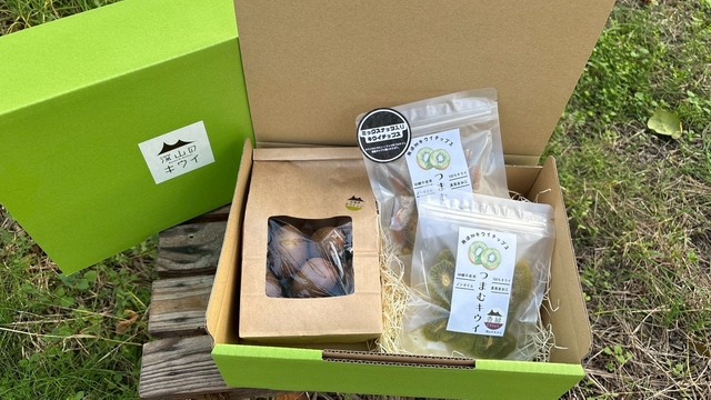 さぬきキウイっことキウイチップスの「つまむキウイ」のセットです。 贈り物に最適! あまくてちいさくてかわいいさぬきキウイっこに深山のキウイオリジナルキウイチップス「つまむキウイ」を付けました。 生果実のキウイっこを食べた後にじっくり長く味わえるドライキウイで楽しんでもらいたくてセットにしました。 つまむキウイは完熟で甘いキウイを手作業で薄くスライスしてじっくり低温で時間をかけて乾燥させました。低温で乾燥させることで甘みがしっかり残り、酸味とのバランスが良く、おやつにもおつまみにもなるキウイチップスになりました。添加物はなにも足していません。100%キウイのおやつで、お子様や健康志向の方にもピッタリ! さぬきキウイっこ袋入り600g(約10個~20個)が1袋とつまむキウイ大が1袋とつまむキウイナッツ入りが1袋入っています。 熨斗おつけできます。必要な場合はご注文の際、備考欄に詳細をご記入ください。 内容量: さぬきキウイっこ糖度: 15度以上 内容量: さぬきキウイっこクラフトパック(600g/袋)✖1袋 つまむキウイ大 35g つまむキウイナッツ入り 50g ※ミックスナッツ入りになります。アレルギーがある方などナッツ無しに変更も可能です。 発送形態:段ボール80サイズ ※発送時期は12月26日までのご注文は年内に発送いたします。12月27日以降のご注文は年明け1月5日以降の発送になります。