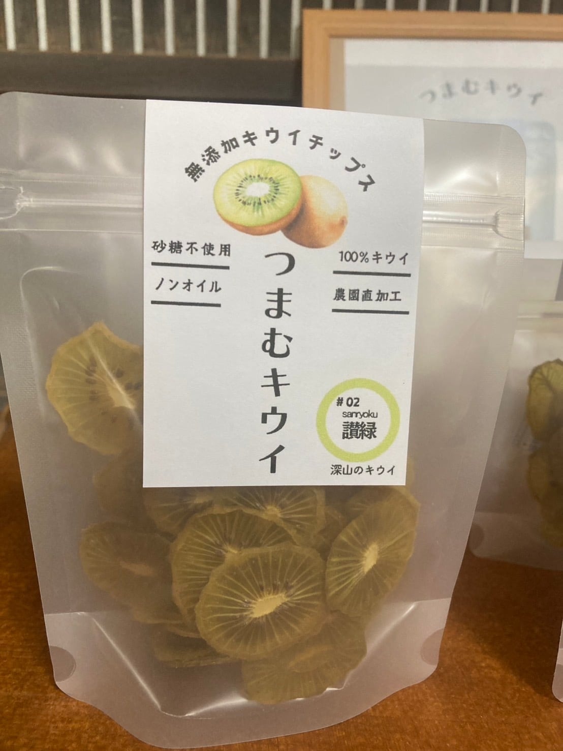 あまくてちいさくてかわいいさぬきキウイっこに深山のキウイオリジナルキウイチップス「つまむキウイ」を付けました。